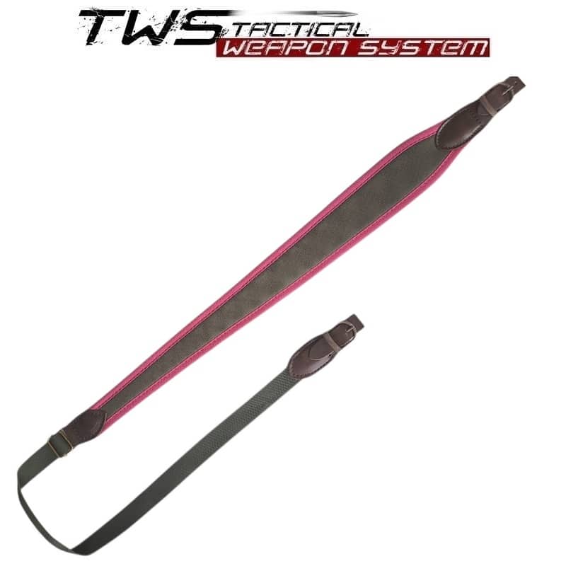 Wytrzymały pas nośny myśliwski 110–130 cm wykonany z Cordury Naturelle, z neoprenowym spodem zapobiegającym zsuwaniu oraz regulowanymi skórzanymi zapięciami. Zielony z modnymi różowymi akcentami. Idealny do broni, outdooru i taktyki