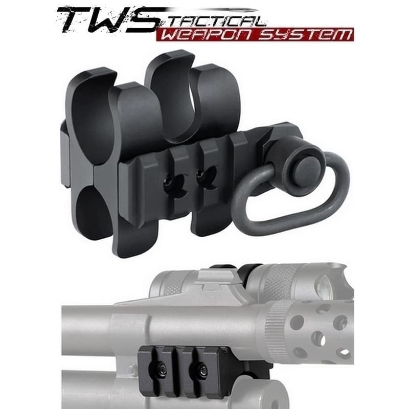 Uchwyt montażowy latarki na lufę – Barrel Clamp 12 GA z dwiema bocznymi szynami Picatinny oraz gniazdem QD”wciśnij kropka”